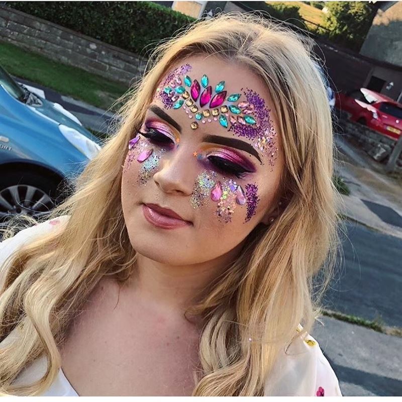 Få en unik och glittrande look med våra ansiktsmycken! Kom dock alltid ihåg att testa dem på en liten del av huden innan du använder dem och sluta använda dem omedelbart om du upplever obehag eller irritation.